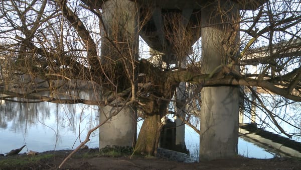 The experience left Martin with many questions. Having been requested by a programmer at NW Film Forum to create a film short about land use, Martin felt certain there was a bigger story to tell. As a result, she returned repeated to the Ramps to Nowhere, in part to photograph a particular image that had captured her attention. A deciduous tree had grown thick branches around one of the structures, providing a vivid metaphor of the struggle between nature and the abandoned built environment.
