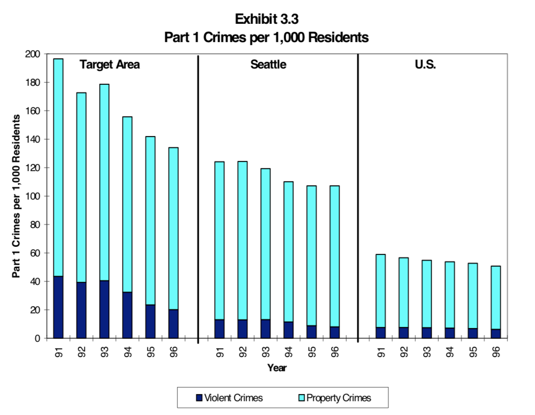 According to the Seattle Case Study, the Central District’s average crime rate prior to the start of Weed and Seed was approximately 1.5 times greater than the entire city of Seattle and approximately 2.5 times greater than the United States.