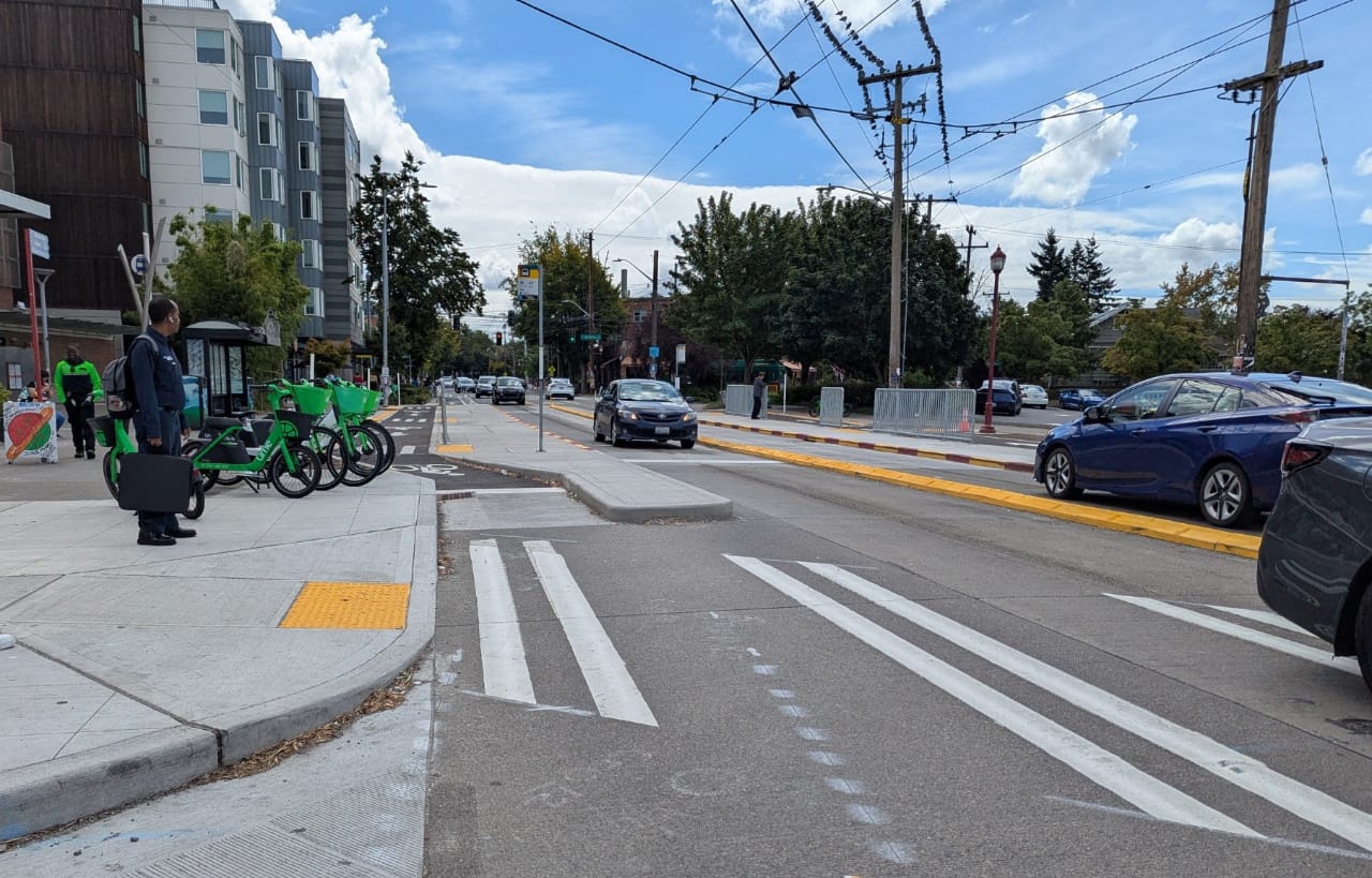 “We are very excited to see Phase 1 completed for Beacon Hill’s new bike route, and cannot wait until it connects further south,” Robert Getch, who was co-chair of the traffic safety advocacy group Beacon Hill Safe Streets during a pivotal time for the project, told The Urbanist. “For now, we hope people enjoy better access to our businesses, better sidewalks to enjoy with your family, and enhanced crossings and transit stops. If you want to help create more change for good join us at BHSafeStreets.org.”