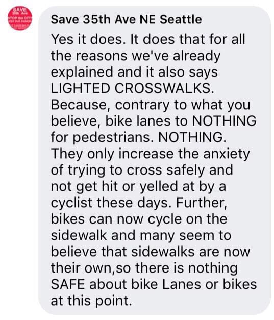 Last week, the sexist, anti-bike (see second image below), anti-safe streets “neighborhood group” Save 35th Ave NE, who has been demanding that the 35th Ave NE repaving not include bike lanes in order to preserve parking, were able to get a late evening meeting with 46th District State Senator David Frockt, and Representatives Javier Valdez and Gerry Pollet. I reached out to all three, asking them to support the environment, and safe and equitable mobility options –and to iterate that we shouldn’t allow residents the ability to veto safety.