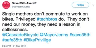 Another vocal critic claimed that bike lanes would lead to gentrification. This is an interesting statement as the census tracts along 35th Ave NE are some of the whitest and wealthiest in the city. Of course, this isn’t an accident. Nearly all of the land along 35th Ave NE is zoned to exclude multifamily and affordable housing –and has been since the 1923 zoning ordinance was adopted. So exactly who, in these neighborhoods of million dollar homes, would be gentrified by a bike lane used by middle and working class families to get around town without being endangered by cars is, um, not exactly clear to me.