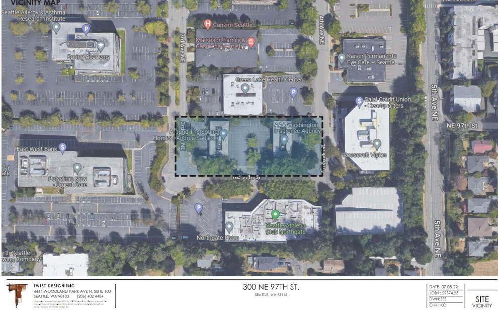 Twin eleven-story towers are in the works for Northgate Terrace, a strip-mall style office park a quarter mile southeast of Northgate Station anchored by Re/Max Realtors and AAA Insurance. The freshly laid site plans, however, are contingent on the Seattle City Council granting a contract rezone to provide a 145-foot height limit. This contract rezone process is often time consuming and could lead to headaches for the developer and delay the towers’ groundbreaking. If it doesn’t go smoothly, the contract rezone may even jeopardize the proposal from becoming Northgate’s first building to move beyond midrise and into highrise territory.