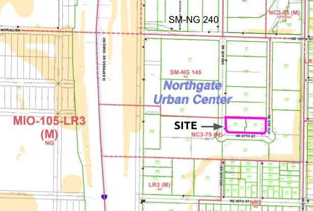 The Northgate Terrace site currently has NC3-75 zoning with a 75-foot height limit, but the developer is requesting SM-NG 145 zoning as the neighboring lot just to the north already has. That contract rezone would boost the affordability requirements as well.