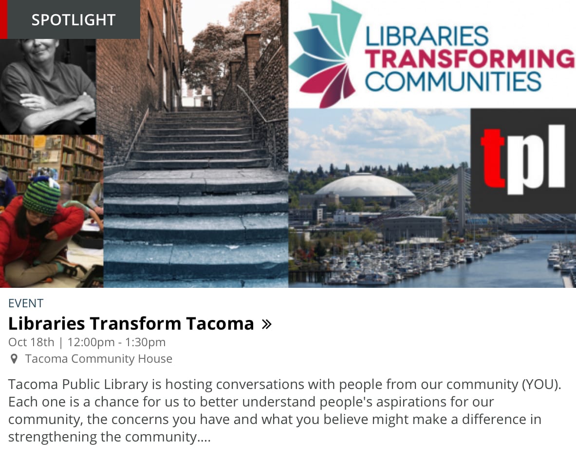 First, the Tacoma Public Library. From early September through early November, the Tacoma Public Library is hosting a series of conversations across the city “to better understand people’s aspirations for our community.” The “Libraries Transform Tacoma” initiative, part of a larger initiative organized by the American Libraries Association, has as a goal to encourage and promote dialogue and deliberation among people who share concerns about communities and want to strengthen communities.