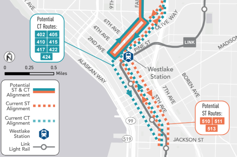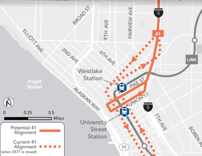 The route 41 is proposed to to change to serve only the northern portion of Downtown on a loop on Pike Street and Union Street (like the Sound Transit 522) until Northgate Station opens in 2021.
