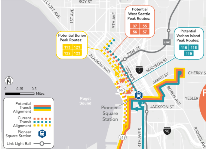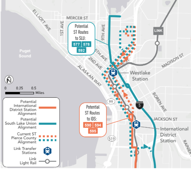 For Pierce Transit routes, the proposal would route some bus routes to South Lake Union (577, 578, and 592) and some to International District (590, 594, 595).