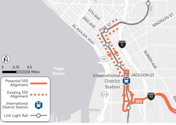 It also proposes truncating the 550 at the International District station, which also would need up to $2.5 million in investment to accommodate extra buses and passenger waiting areas. This change obviously offers no travel time benefit for riders at International District. According to the document, if the buses were to continue to the vicinity of Westlake Station, it would add around three minutes to every trip compared to what it would take now.
