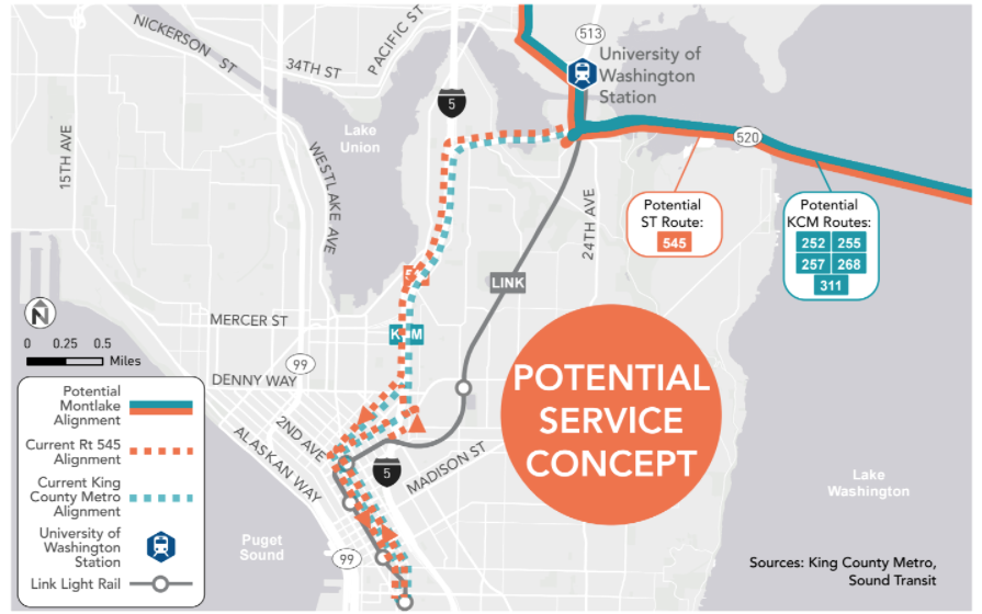 The plan proposes terminating all SR-520-based routes (Sound Transit 545 and Metro 252, 255, 257, 268, and 311) at the University of Washington Station and not having them serve Downtown at all. This would require a $3 million investment in the Montlake Triangle area to create more bus capacity. According to the document, transferring riders at UW Station would offer no change in travel times from current trips for riders going to Westlake or International District stations, and that construction impacts, both from the convention center and the Portage Bay bridge replacement, would add five minutes of travel time to every trip between the Eastside and the International District.