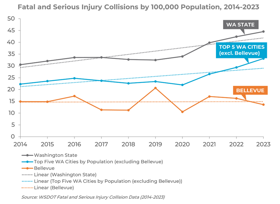 Where there is room for optimism is how Bellevue’s numbers stack up in comparison with other Washington cities. Where cities like Seattle are seeing deaths and serious injuries climb in spite of Vision Zero pledges, Bellevue’s suite of actions — from innovative technologies to signal modifications and more — have contributed to the current holding pattern.