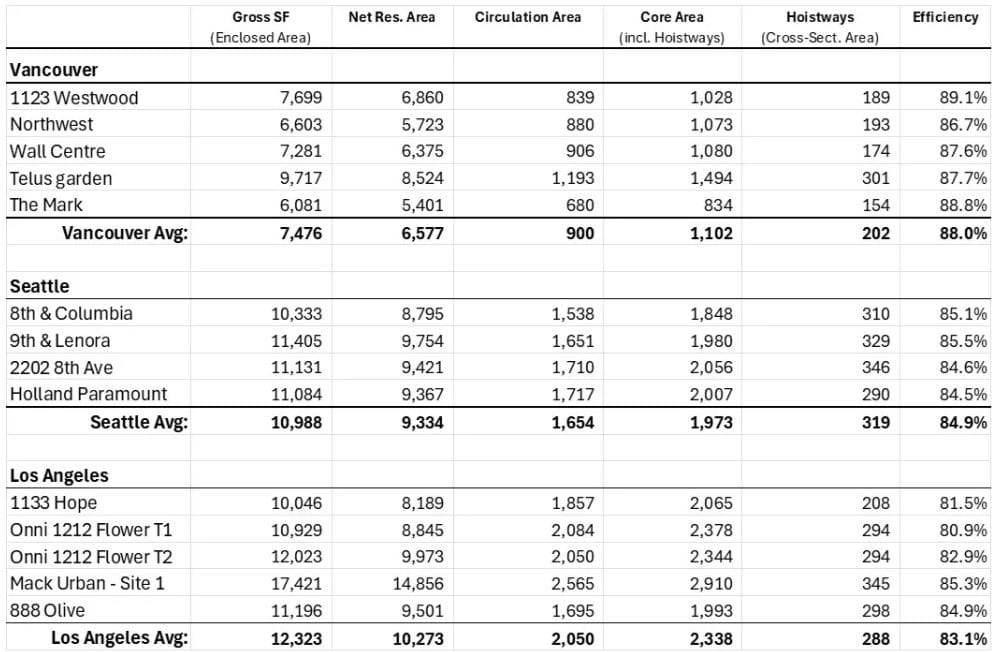 For comparison, building footprints of residential highrises in Vancouver generally range between 6,000 and 7,000 square feet. Whereas in Seattle, residential highrise development typically has building footprints between 10,000 and 11,000 square feet. Even when trying to compare a similar-sized development in Vancouver (i.e., Telus garden) to a Seattle development (i.e., 8th & Columbia), the Vancouver development with scissor-stairs has 2.5% or 225 to 275 square feet more leasable building area per floor than the Seattle development with spatially remote stairwells. That may not seem like much of a difference, but 70 to 100 square feet can mean an additional bedroom or private outdoor deck space for several units per floor.