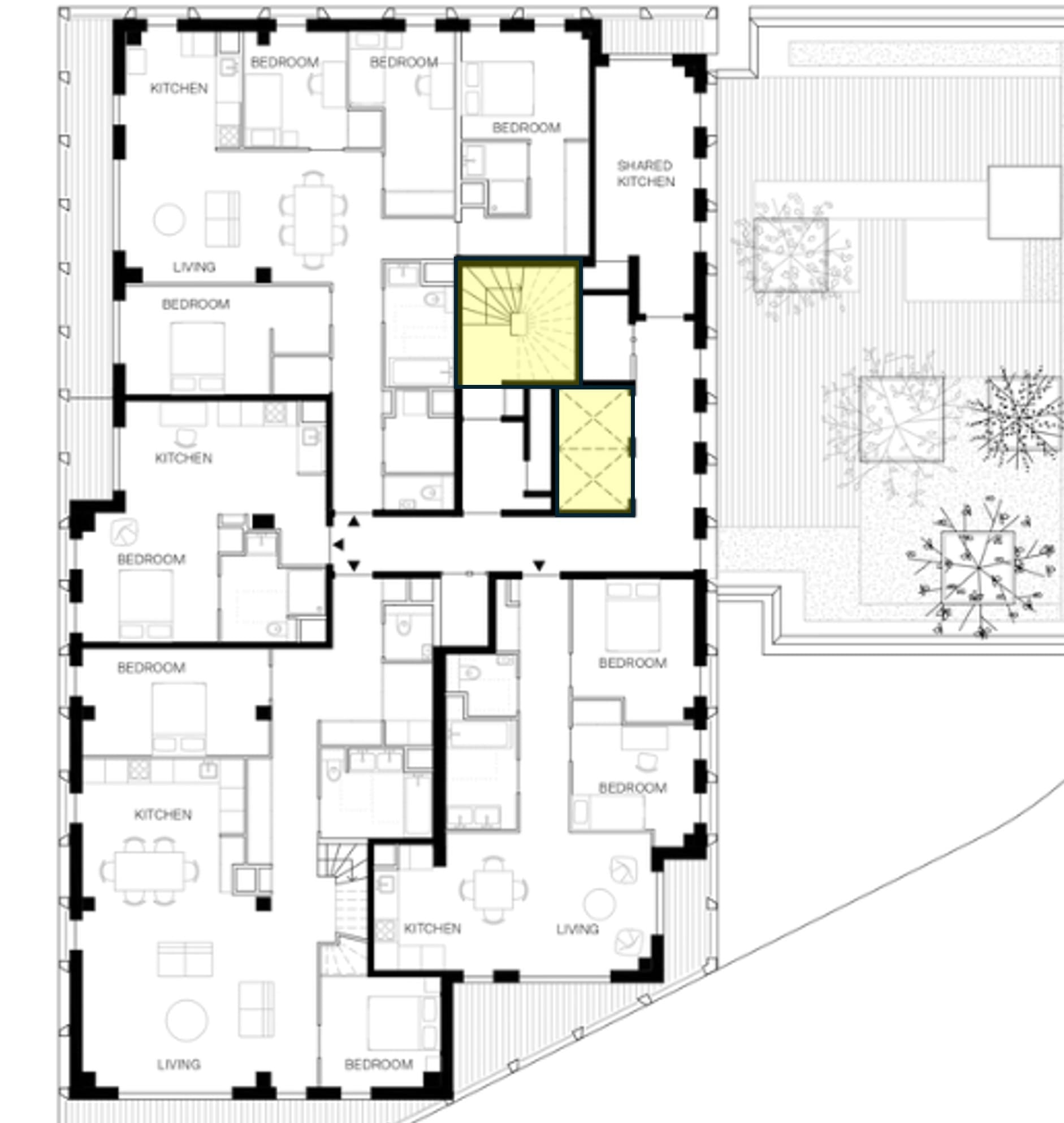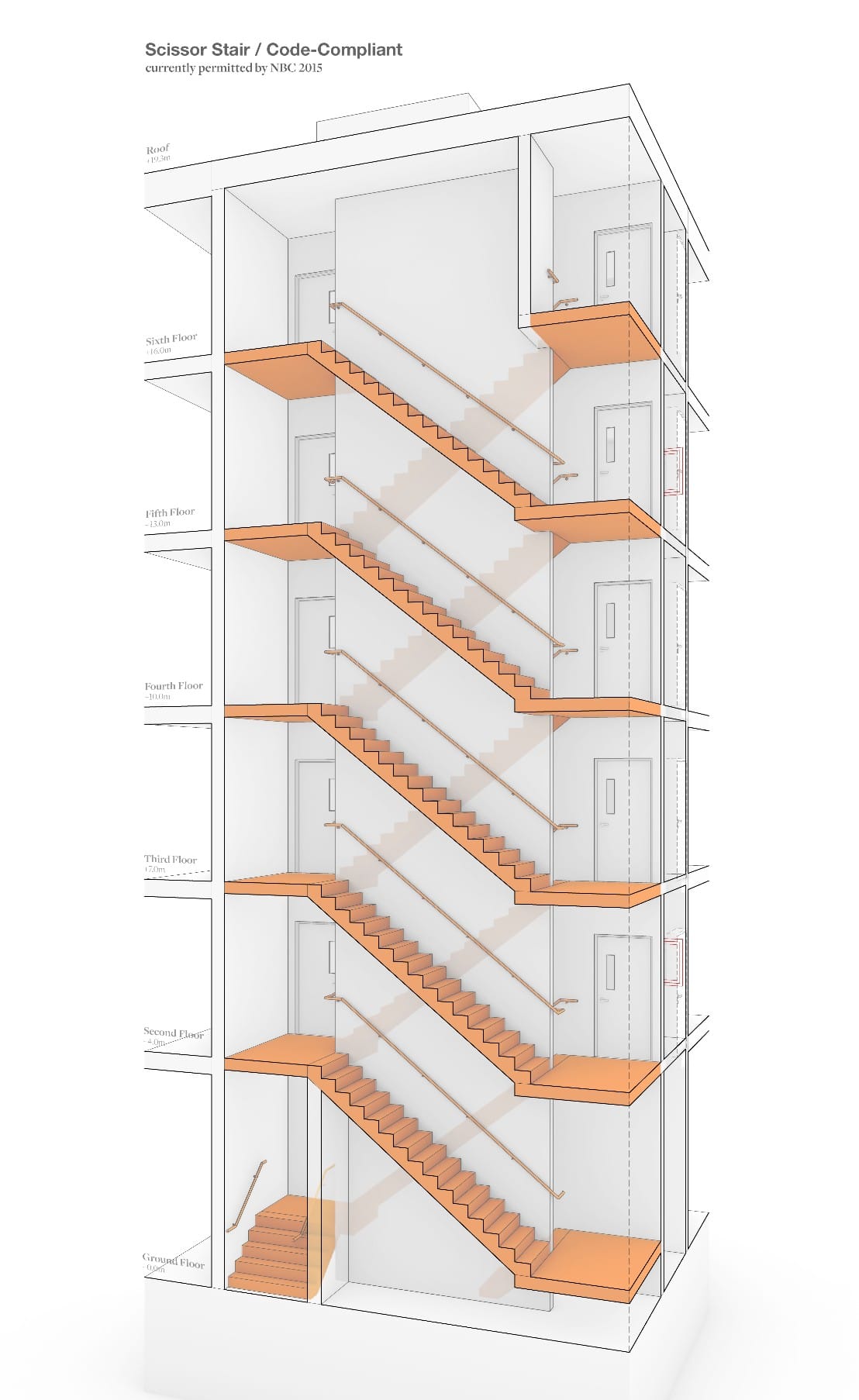 Scissor stairs allow for less space dedicated to stairs, hallways, and elevators in a building and more space for living space. This allows for the entire building to be skinnier or more compact than the buildings we typically build in Seattle, which saves on the amount of land needed to construct the building and the overall construction cost because one is constructing a smaller building.