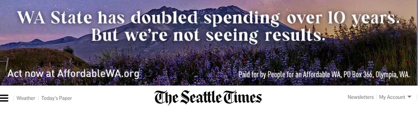You have probably seen “People for an Affordable Washington” advertisements splashed all over social media. They’re not actually people, but a corporate lobbying firm bankrolled by Microsoft, Alaska Air, the Alliance for a Competitive Economy, Madrona, and T-Mobile. Those are their top five funders.