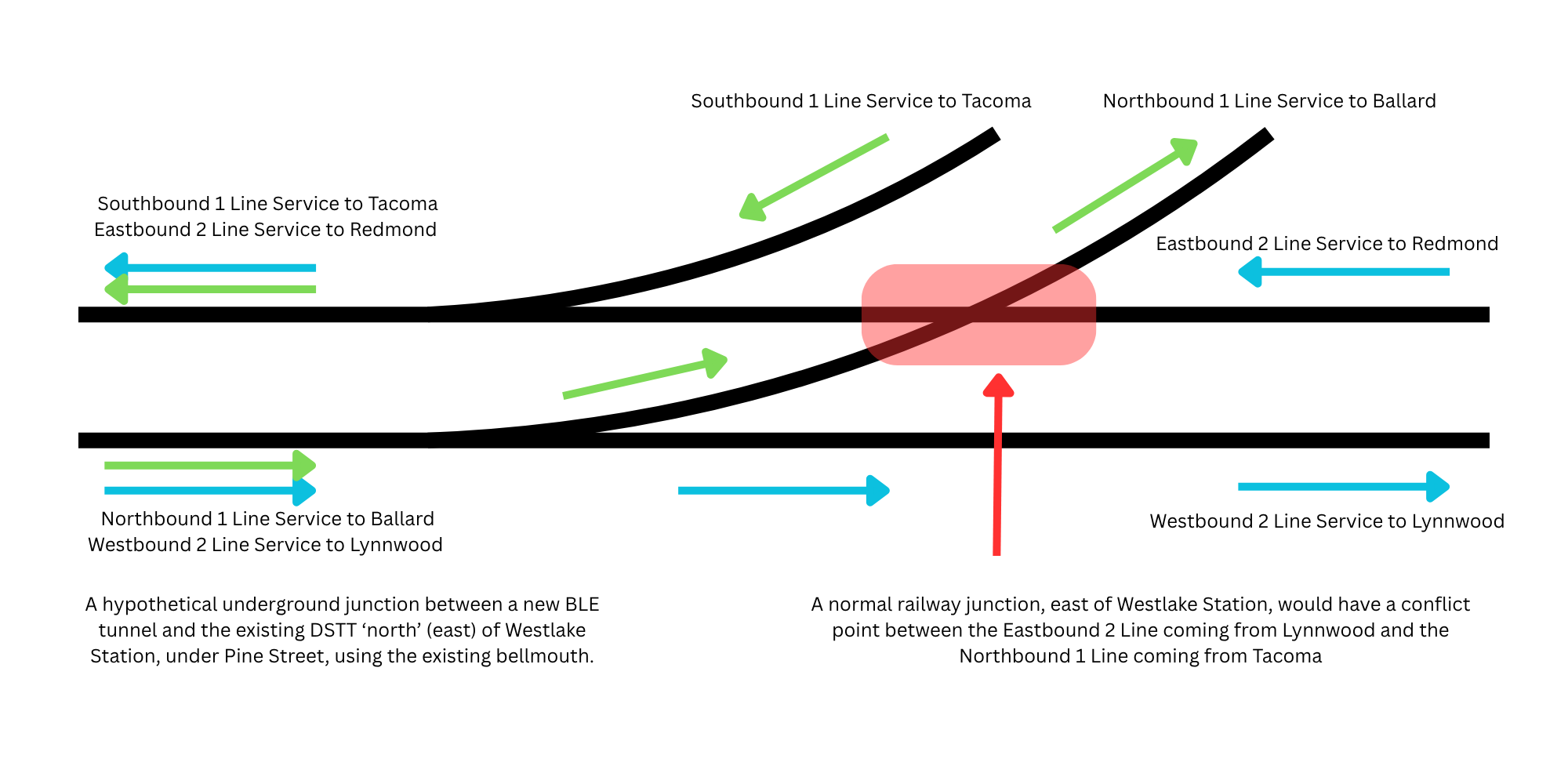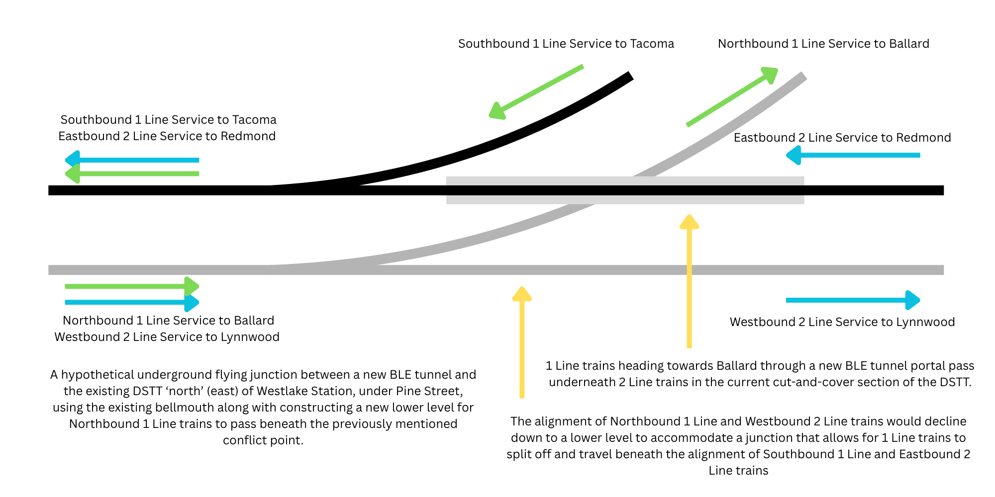 There is a limited, extremely theoretical opportunity for such a flying junction to be constructed north of Westlake station along the section of tunnel extending past Westlake Station along Pine Street. Between the eastern end of the Westlake station box along 6th Avenue and the beginning of the TBM-dug University Link tunnels at 9th Ave, this section of tunnel was dug using cut-and-cover methods, meaning the tunnel is relatively close to the surface. Additionally, a bellmouth (a space protruding out of the main tunnel structure) exists as a relic of the now-demolished Convention Place station, which could be hypothetically used to accommodate one of the levels of the underground flying junction. A hypothetical service scenario where a (non-flying) rail junction is constructed using this existing bellmouth structure is illustrated below.
