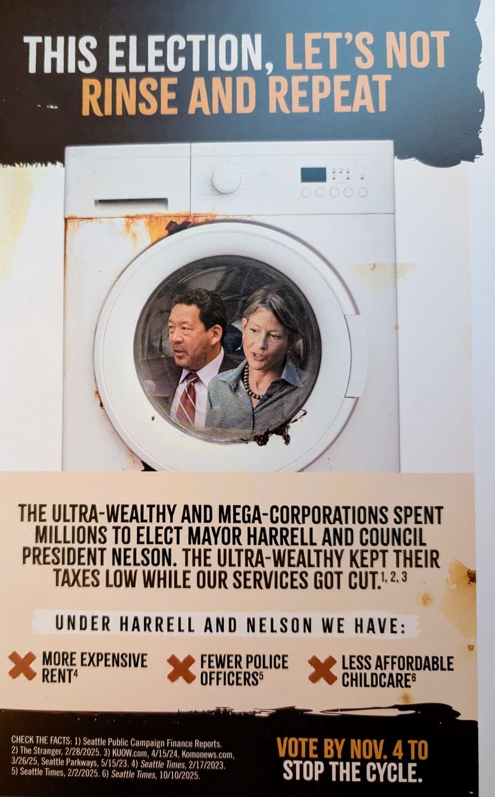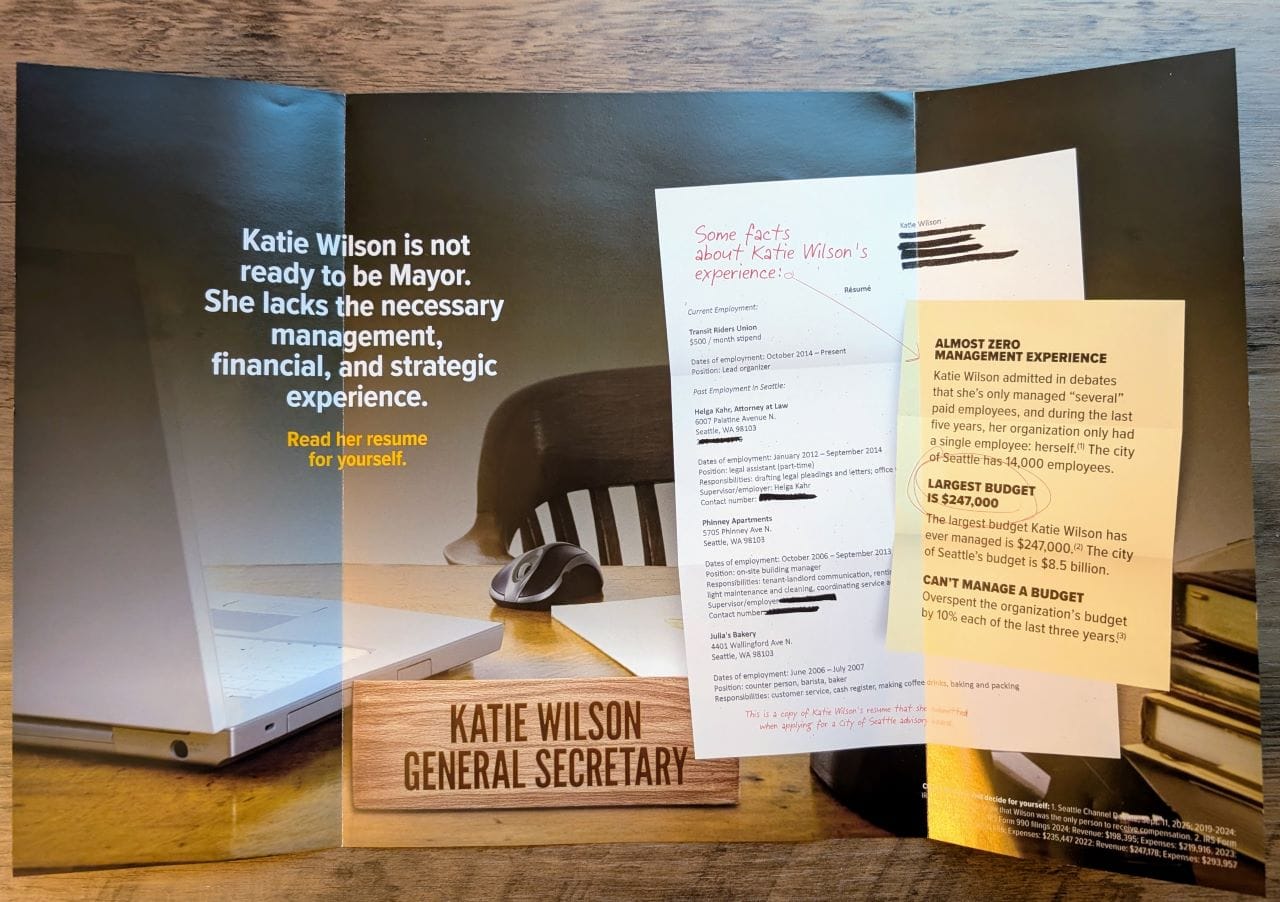 Fortunately, progressives had their own independent expenditure effort led by Ron Davis (who ran for city council in 2023 and came up 235 votes short). Dubbed “Katie Wilson for an Affordable Seattle,” the group raised their own warchest, albeit at a smaller scale, and put out effective mailers to help counteract the media blitz from the Harrell camp.