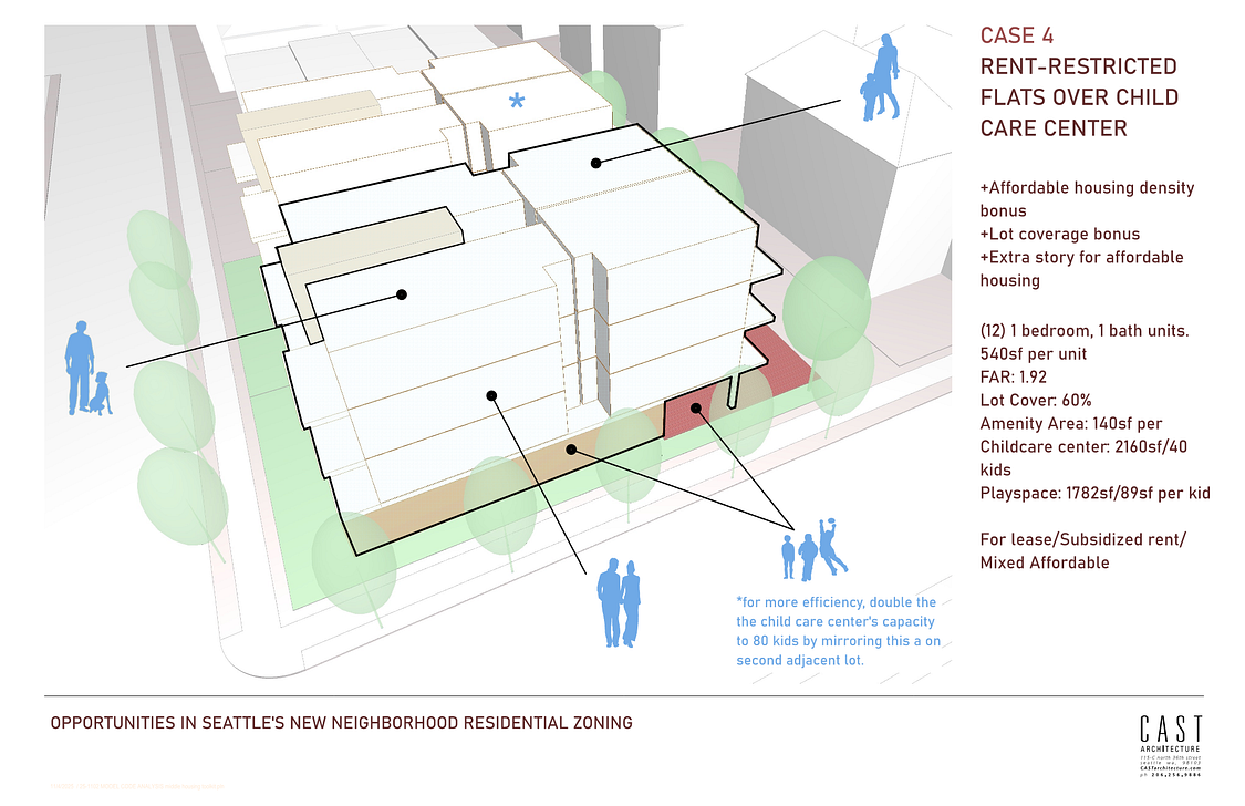 Seattle desperately needs more child care, and the process to certify a new center is rigorous. In order to justify the investment, the basic template is four classrooms, each with twenty kids, plus administration and facilities, and a space for outdoor play. If a provider can assemble two adjacent NR lots, like in Case 4, the ground floor area is the perfect size. This is essentially what many of our larger affordable housing projects are doing — anchoring the ground level with a child care center, then drawing kids from both the housing above and the surrounding neighborhood.