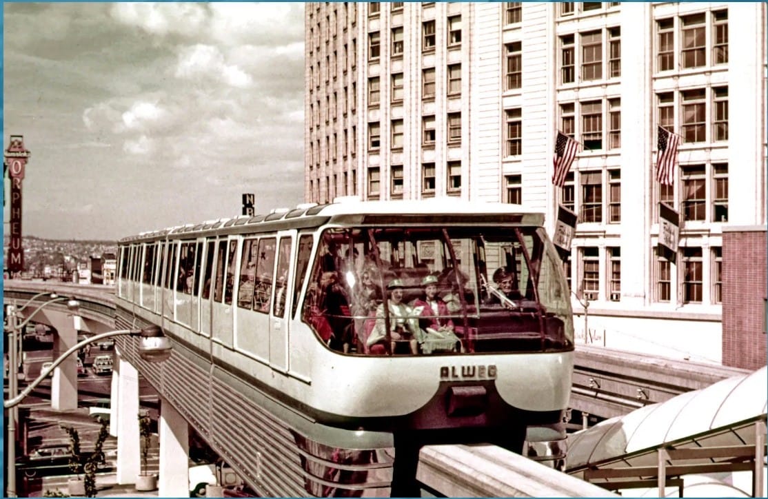 Seattle’s monorail began as a showpiece, built in 1962 for the Century 21 World’s Fair. The idea wasn’t to serve commuters, but rather to dazzle visitors and move crowds between downtown and the fairgrounds. For more dazzling during the World’s Fair, Seattle Center had rollercoasters, which I, for one, am in favor of bringing back.