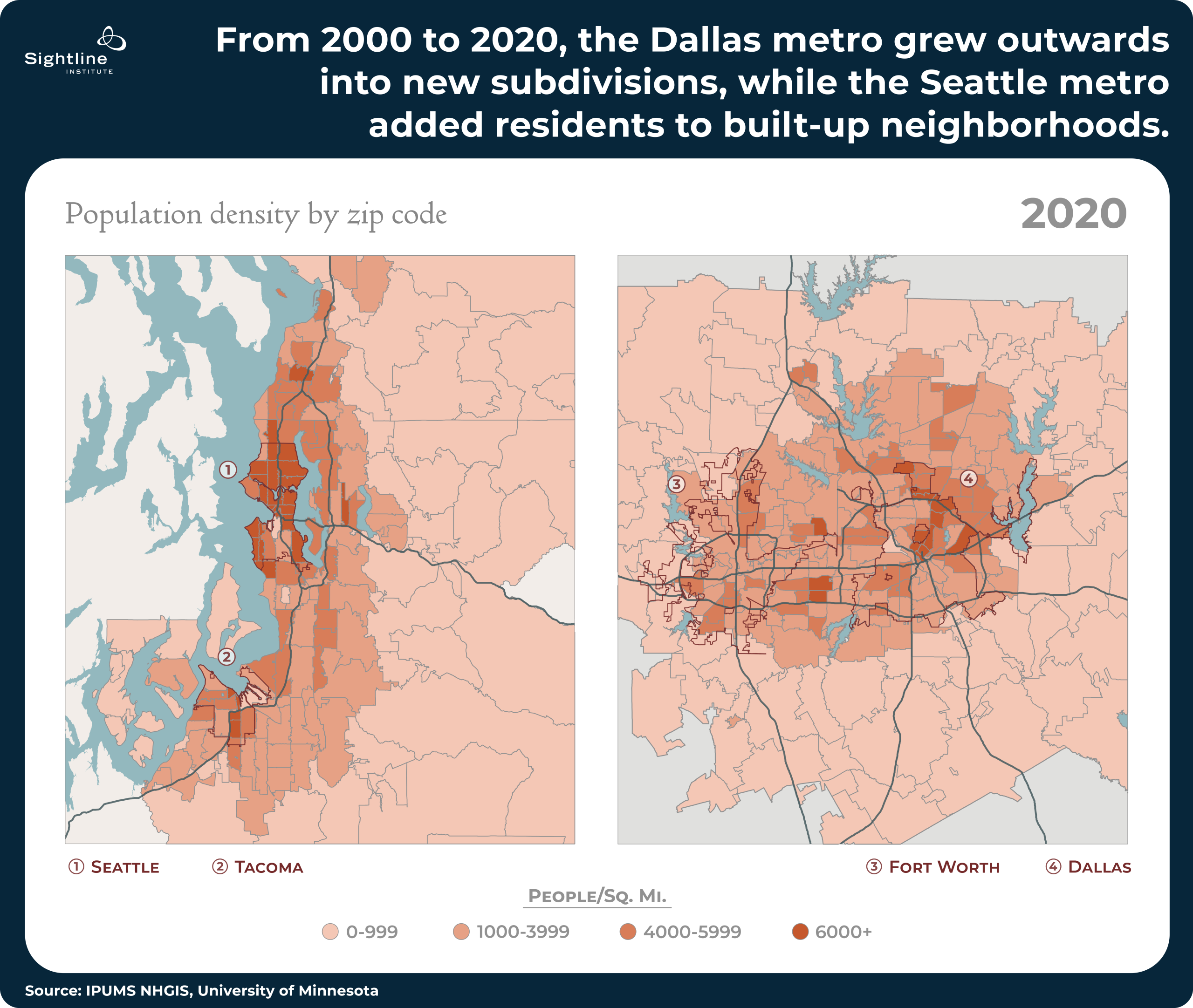 Over the next 20 years, however, the two metros took different paths. Seattle added new residents across neighborhoods of all types, with both new neighborhoods and old neighborhoods growing a modest amount. Dallas, meanwhile, saw booming growth in its least populous neighborhoods, sprawl beyond the prior footprint of the metro, and a loss of residents from its most populous neighborhoods.