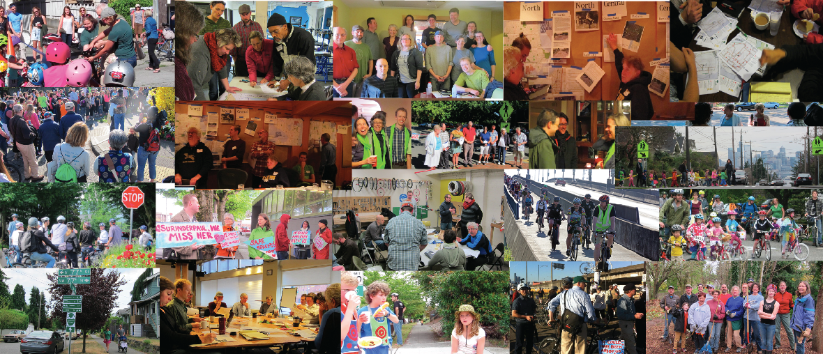 Collage of Seattle Neighborhood Greenways activities over the years. (Seattle Streets Alliance)
