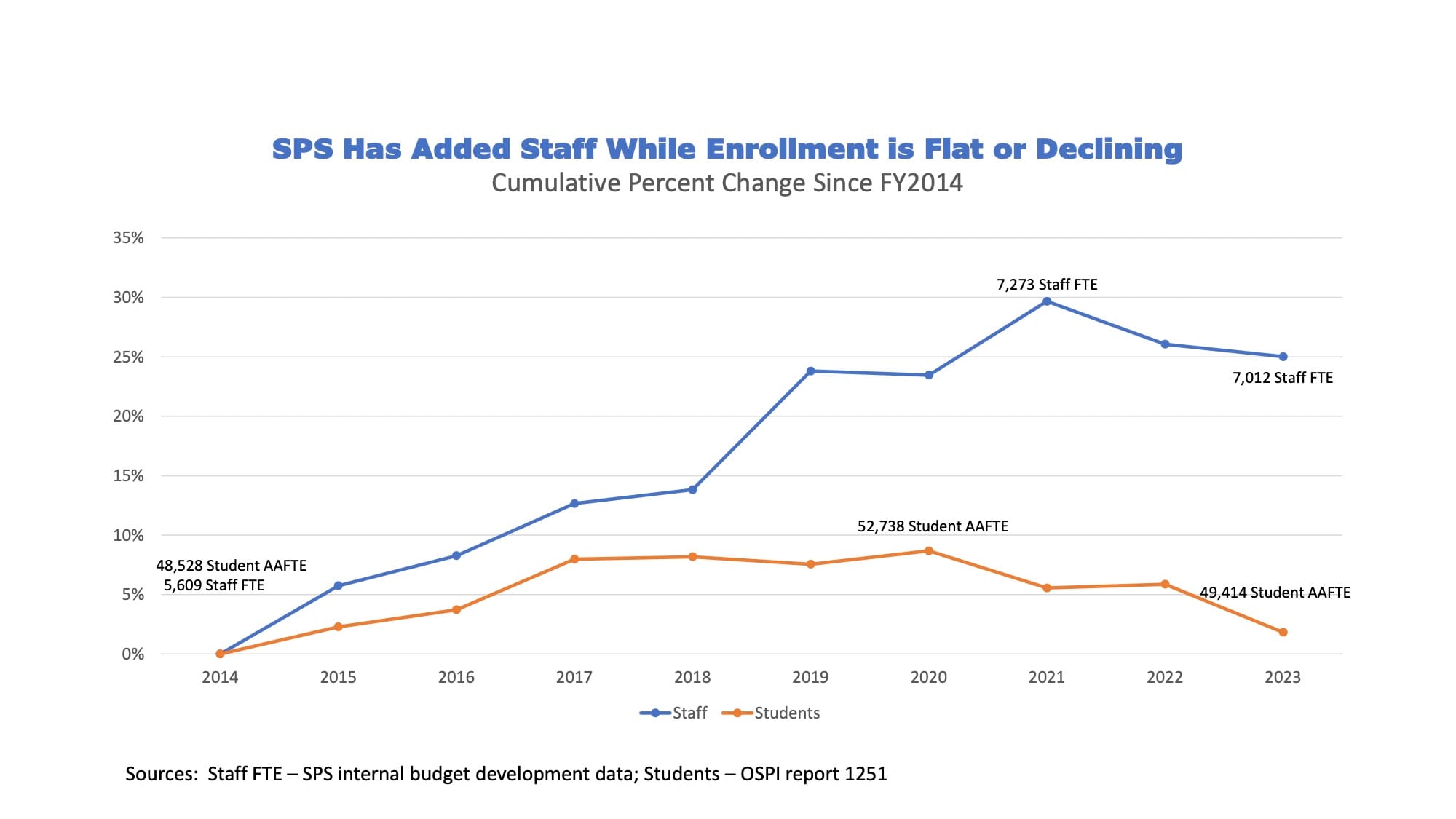 Now, Seattle schools’ population change has not been bad enough to warrant closing schools. While the district relies on unnecessarily dire predictions, SPS enrollment decline has not been as precipitous as the impacts of the pandemic and housing costs would suggest. SPS has lost about 3,000 students since the start of the 2019-20 school year. That brings the district down to the same enrollment they had in 2013-14, with roughly the same number of schools as are currently in operation.