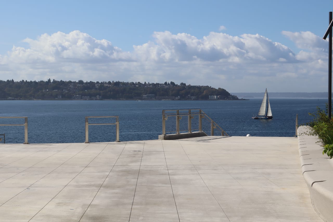 As Overlook walkers descend from the top of the Overlook Walk, the steps turn into stadium-style seating that the City of Seattle is calling the Salish Steps. Here traffic noise is replaced by the din of the mechanical systems for the Seattle Aquarium’s new Ocean Pavilion. The Salish Steps would make for a cozy concert venue, though it’s not clear how often Friends of Waterfront Seattle will be activating the space in that way, with much of their programming to date conducted at nearby Pier 62.