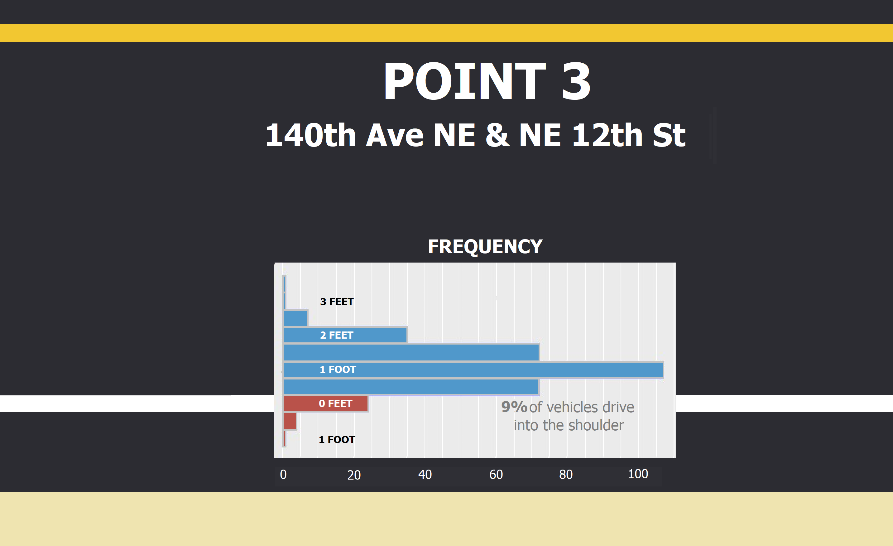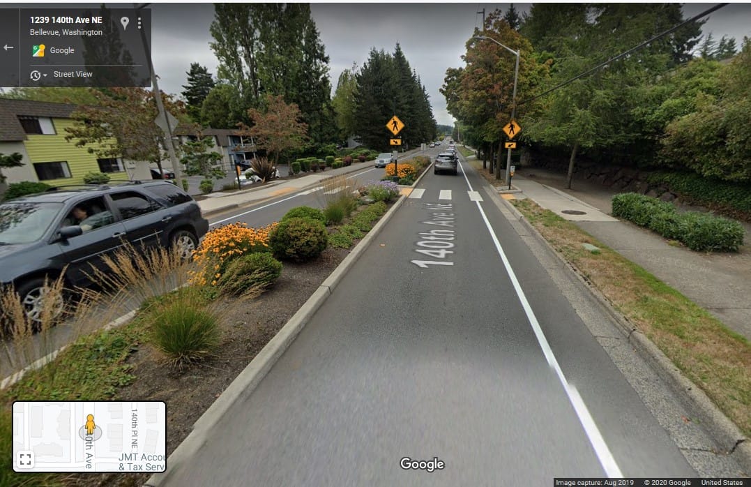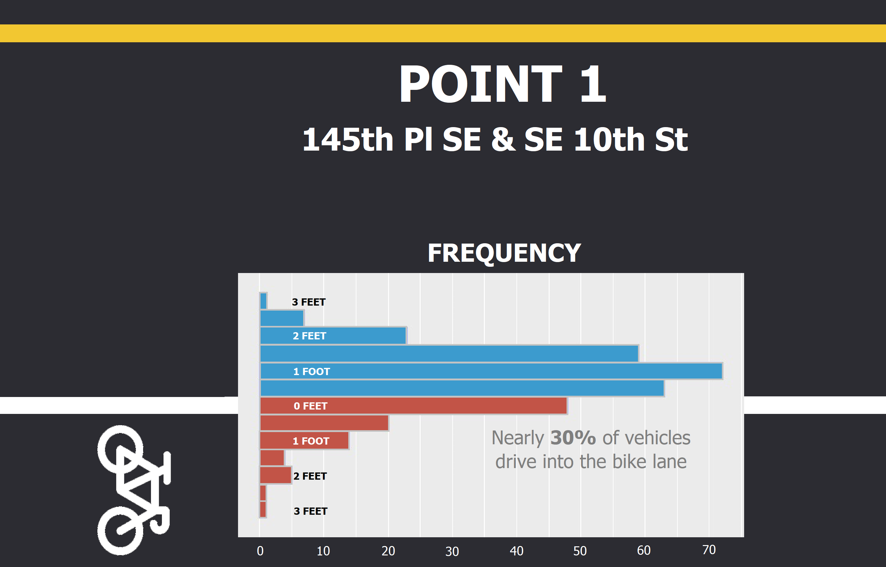 To do so, I selected three sites on 140th Ave, a frequently-used cyclist corridor in east Bellevue. Although there are painted, intentional bicycle lanes along nearly the entire corridor, there are no buffers, barriers, or other mechanisms to ensure cyclist separation and protection from drivers. I therefore assessed driver behavior at the above three points by noting how far (if at all) they crossed over the paint line demarcating vehicle and bicycle separation. Points 1 and 3 (see above map) represented a curved and straight point, respectively, where road width is constricted by a median, so I measured how many feet drivers were away from the paint line as their vehicles passed.