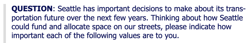 Any confusion over the polled Seattle voters wishing to see streets made more convenient for cars was laid to rest, however, by the results from questions that followed, both of which addressed ideas for making streets more people-friendly.