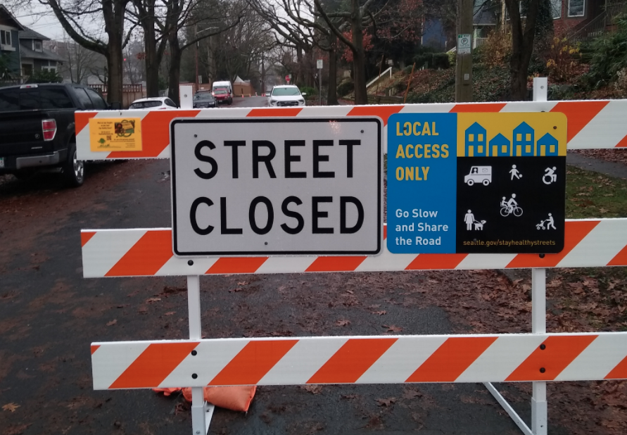 Signage on Stay Healthy Street discourages through-traffic and allows people to legally walk in the roadway to more easily distance from others. Stay Healthy Streets are similar to, but not exactly like, Keep Moving Streets that have been created near Seattle’s most popular parks. Branding aside, both are pedestrianized open streets with some accommodations for cars.