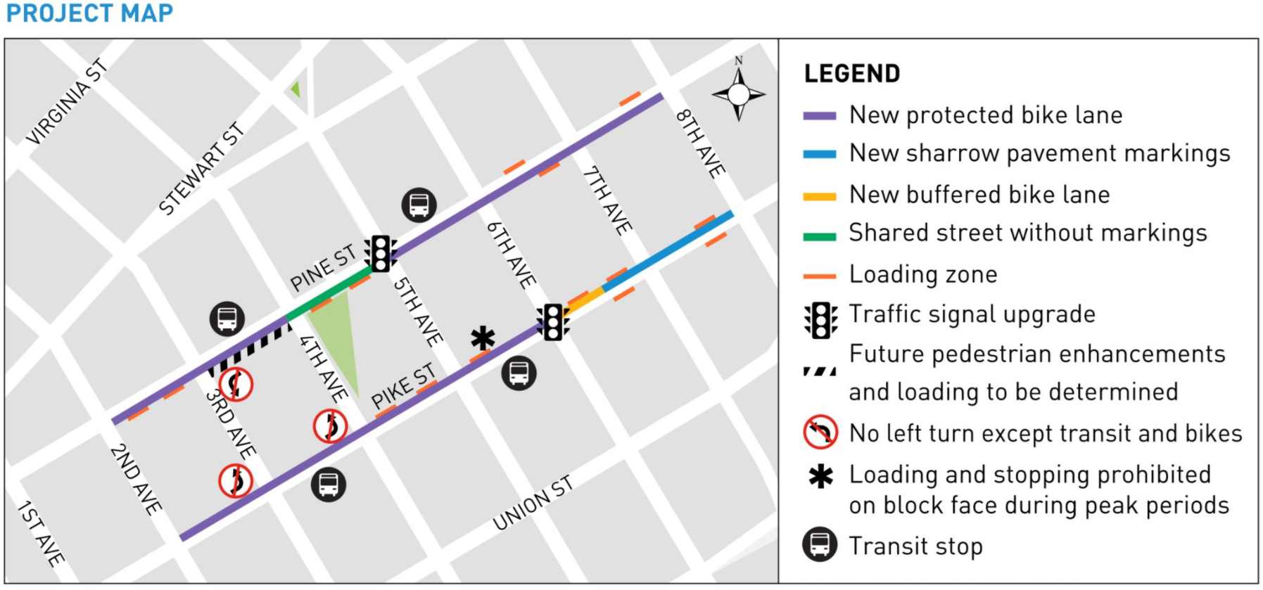 The biggest impacts are at the intersections where there were the most conflicts: Pike and Fourth Avenue, where drivers are not allowed to turn left onto Fourth Avenue at all, and Pine and Fifth Avenue, where there is now a dedicated phase holding left turns.