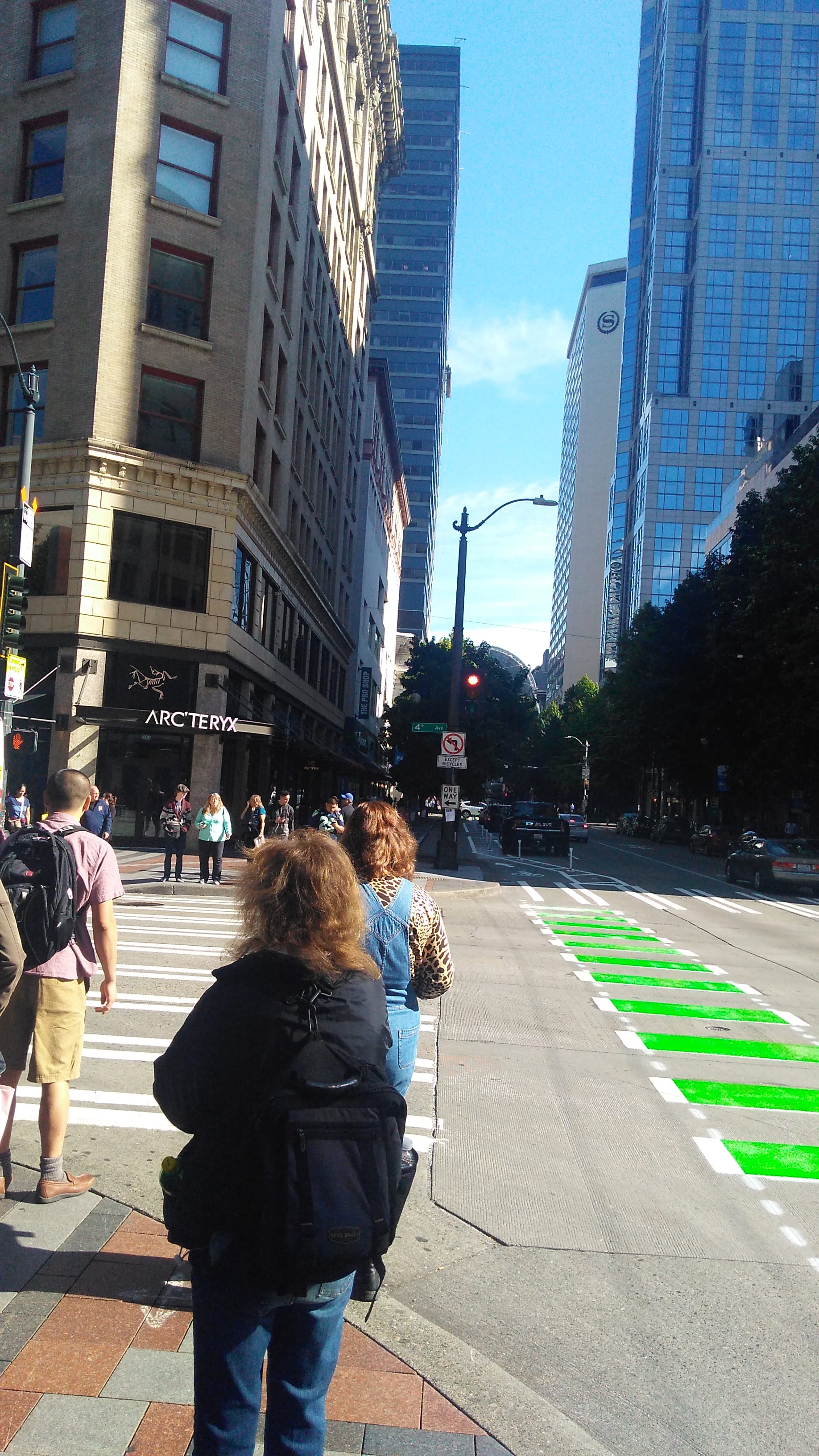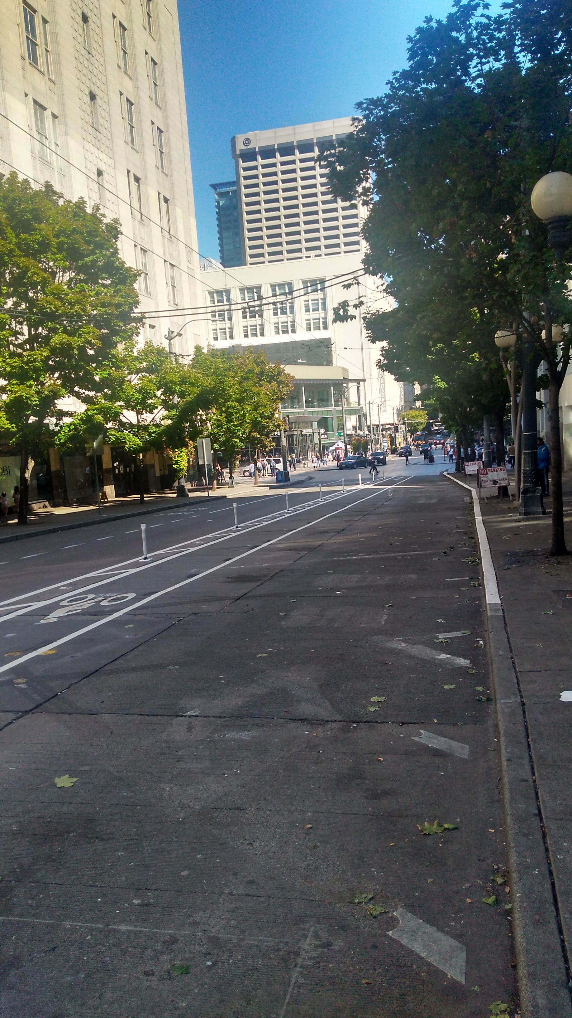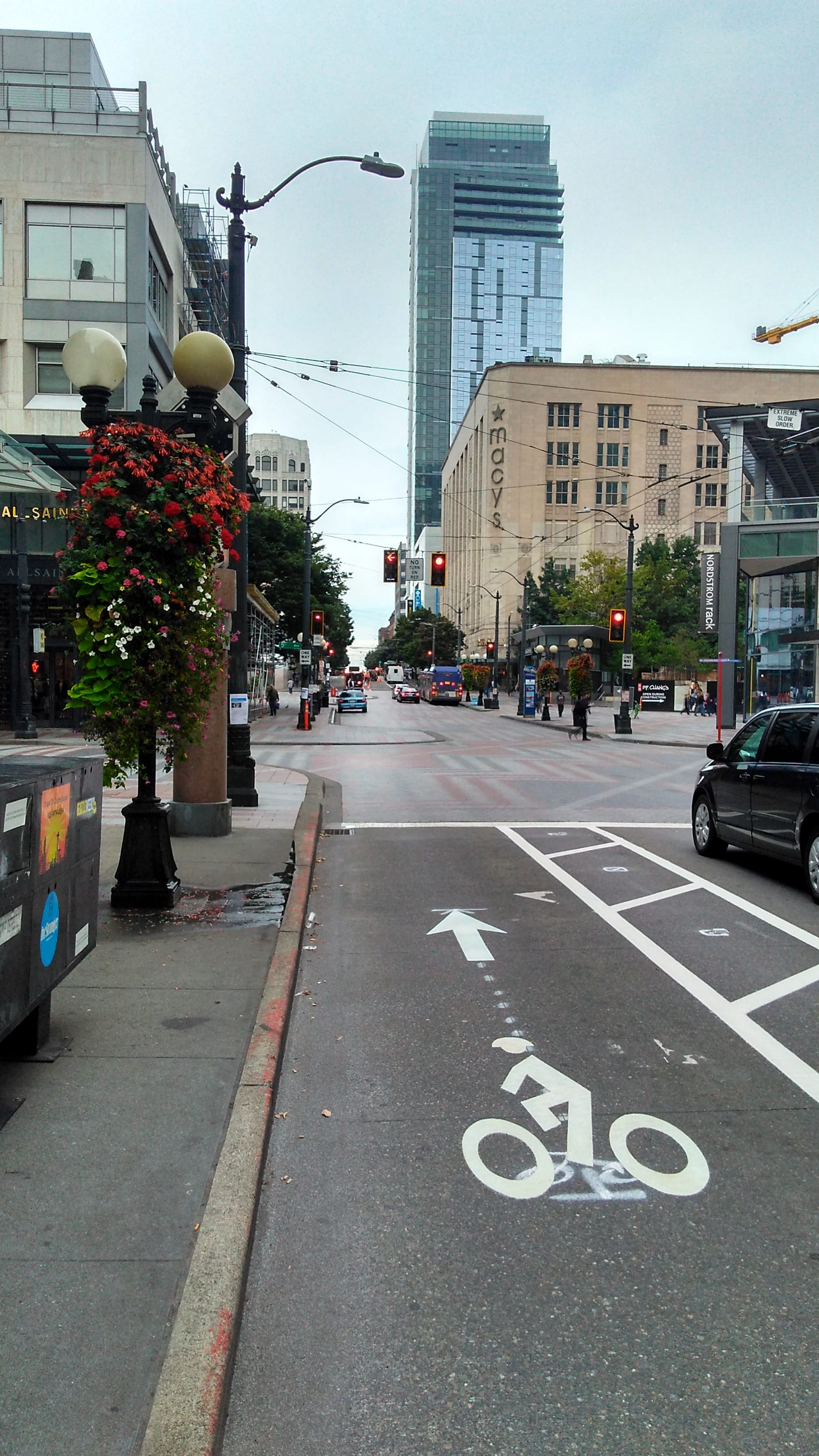 Pine Street is another matter. For riders coming from Capitol Hill, currently you have to cross the entirety of Pine to get from the painted bike lane on the right side coming down the Hill to the start of the protected lane on the left. This happens directly in front of the Hyatt hotel where there are likely to be a lot of vehicles entering and exiting the driveway. In addition, when you get to Fifth Avenue, cyclists are forced to merge into the shared space of Westlake Plaza. Any changes to the decorative tiles were essentially off the table in order to separate the modes, so this is what we are left with. The only silver lining with this merge is that the leftmost travel lane is now a turn-only lane, so cyclists should have a lane to themselves with traffic going straight on the right side lane.