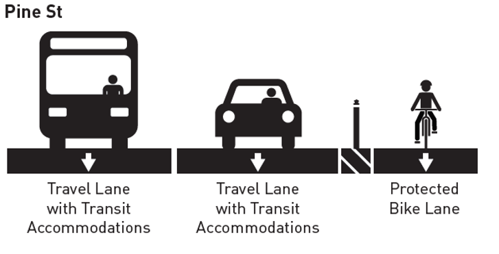 On the Pine Street side, riders heading to downtown from Capitol Hill westbound would also enter a full street of shared traffic at Westlake Plaza between Fifth and Fourth Avenues. On both streets the proposed PBLs are located in place of the lefthand travel lane.