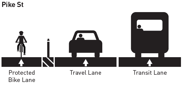 Despite the fact that the plan includes fewer blocks of protected bike lanes every single time there are more details revealed, this would represent a big change in downtown bike mobility and provide a chance for SDOT to test out a street configuration in a fast and relatively cheap way. There are still some open questions, including how the existing parking lane on Pike Street would interact with the bike lane, but this represents a big step forward in implementing the Basic Bike Network.