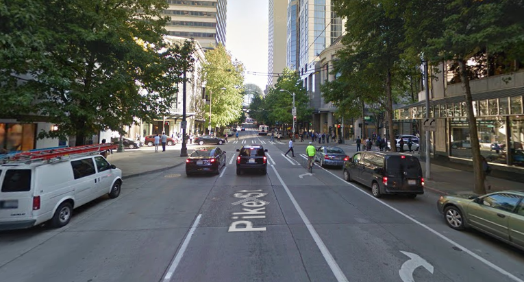 The protected bike lanes on Pike Street, which would take users up to Capitol Hill eastbound in the direction of traffic, are proposed only between Second and Sixth Avenues. After Sixth Avenue, riders would travel in a buffered bike lane for an additional half block, after which point the bike lane would disappear, with riders sharing the lane with traffic. Seventh Avenue will be getting a one-way protected bike lane of its own by next year, and at that time vehicle turns would be restricted from Pike Street onto Seventh Avenue. Restricting turns now would allow the bike lane to be extended to Seventh Avenue.