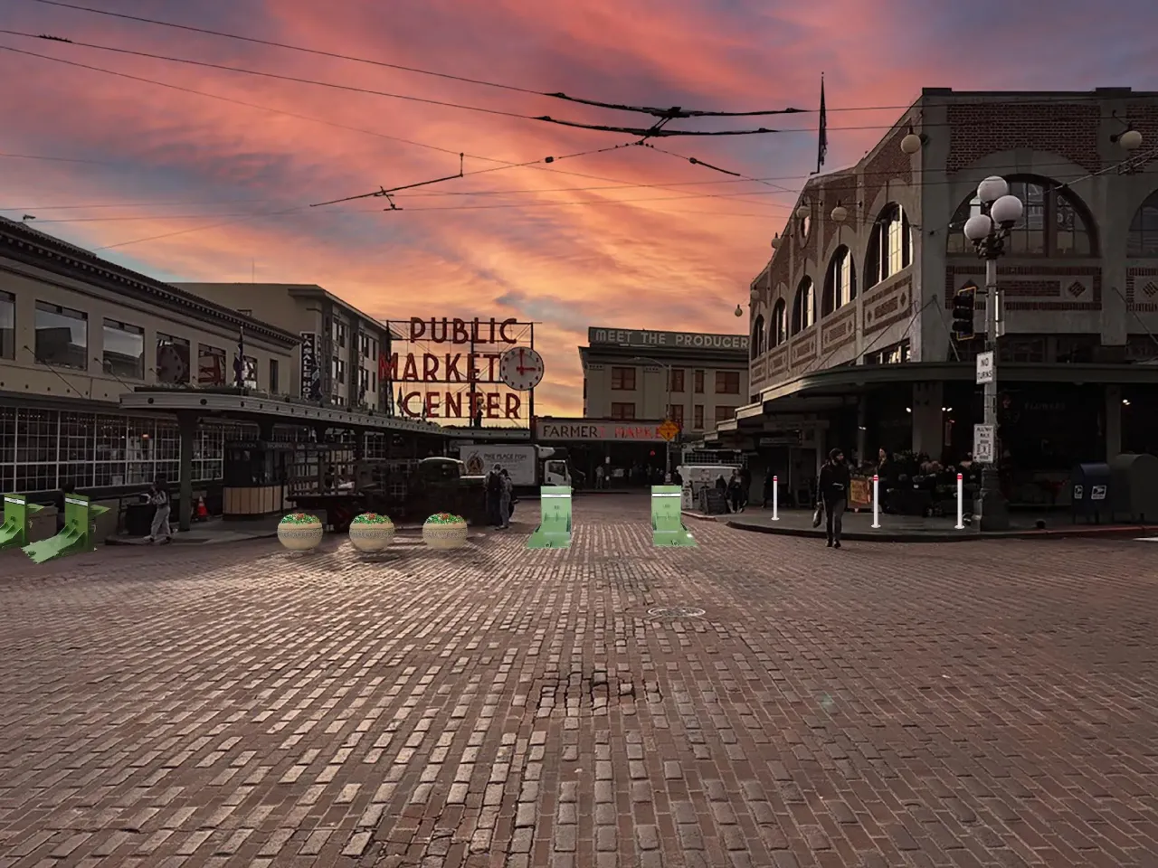 In the coming weeks, the Seattle Department of Transportation (SDOT) will install additional hardening infrastructure at the Market's primary entrances, changes that will allow full closures of Pike Place on FIFA Men's World Cup match days. Those updates include bollards along sidewalk edges that will prevent any drivers from ignoring new movable, crash-rated barricades of the type commonly seen near parade routes. The Market Historical Commission, a City-established board that oversees the historically-designated preservation district encompassing the entire Market, granted temporary approval for these changes that only extends until this fall.