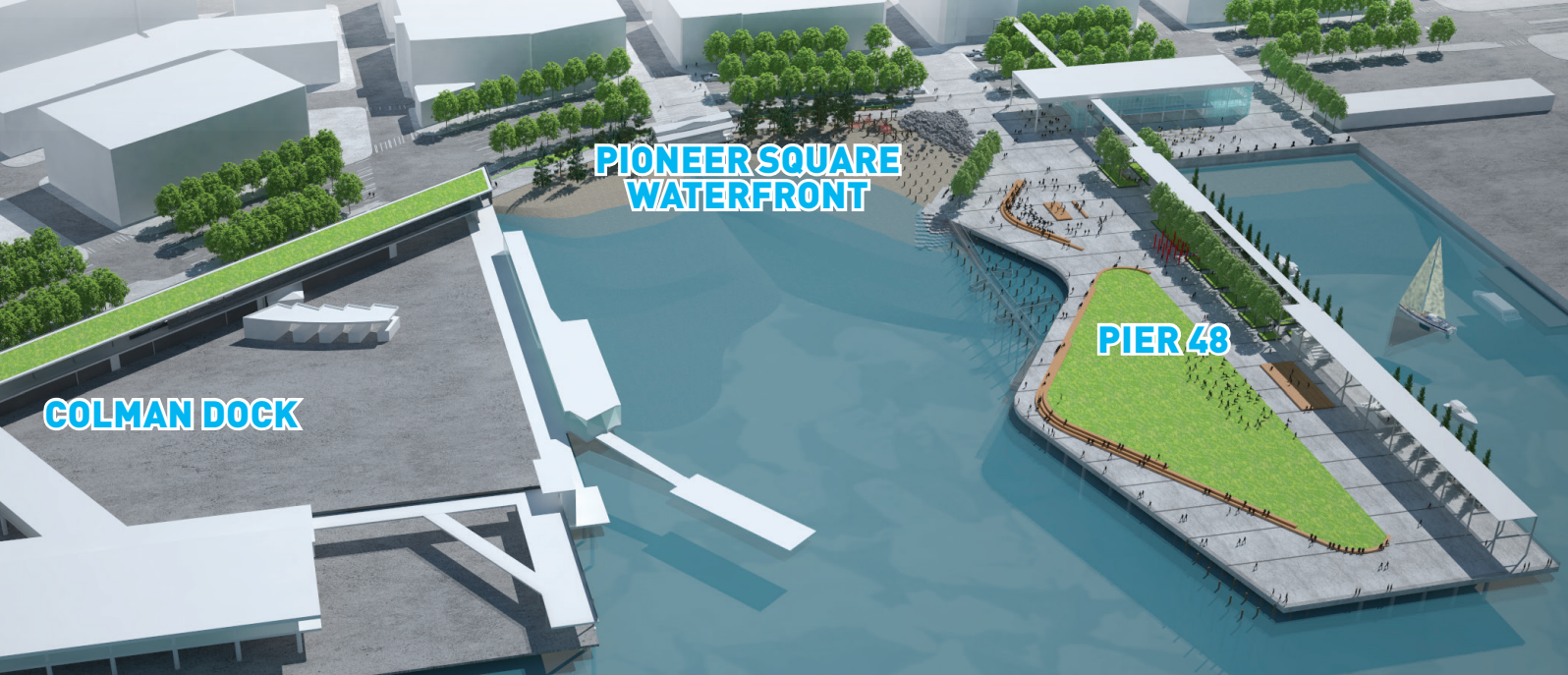 In 2015, a concept plan for the area included an ambitious vision for Pier 48, making it a south waterfront counterpart to the new aquarium under construction to the north, with a new park jutting into Elliott Bay complete with two reconfigurable stage spaces, and a large “headhouse building” containing retail storefronts. This new space was envisioned as a place for concerts (with a historical nod to when Nirvana played here in 1993) and events like fireworks viewing.