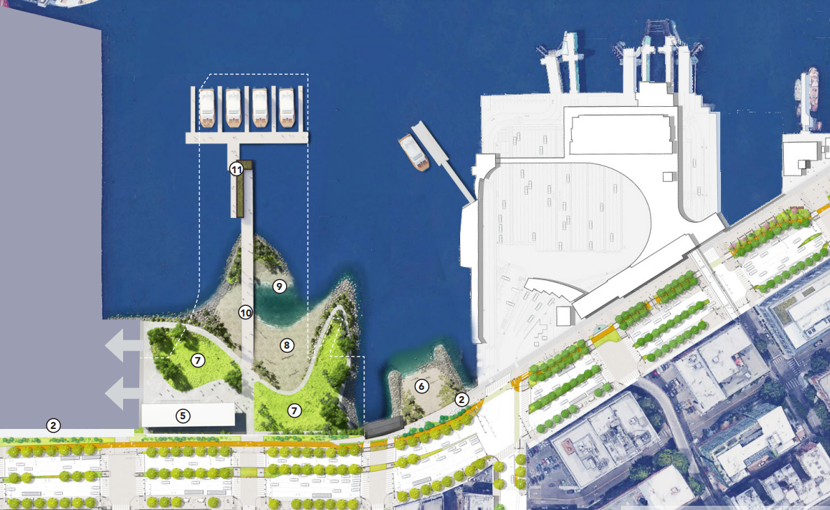 But revamping Pier 48 into a foot ferry terminal needn’t be framed as at odds with increasing the amount of public space. In 2021, the Office of the Waterfront, funded by a grant from the Washington Department of Commerce, finalized a new concept for Pier 48. Developed in conjunction with city organizations with ties to south downtown, the result is a much more scaled-back vision than the two-event-stage pier from 2015, but includes a larger beach space, some green space, and a building that could accommodate retail. It also includes slips for new fast ferries.