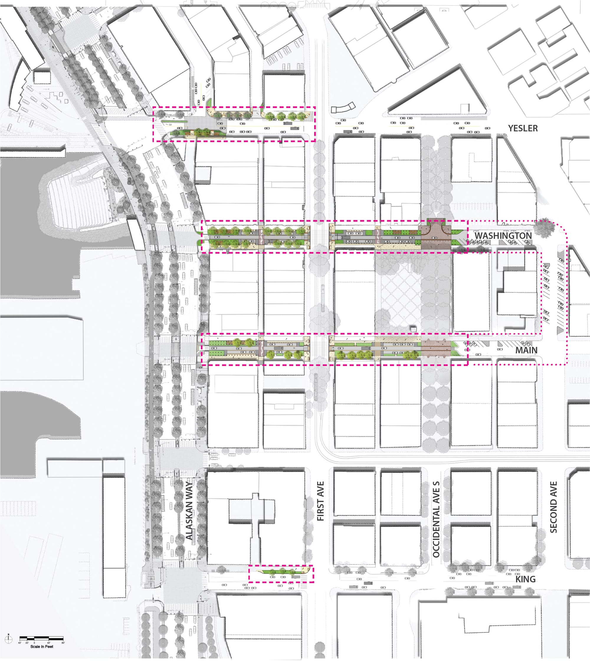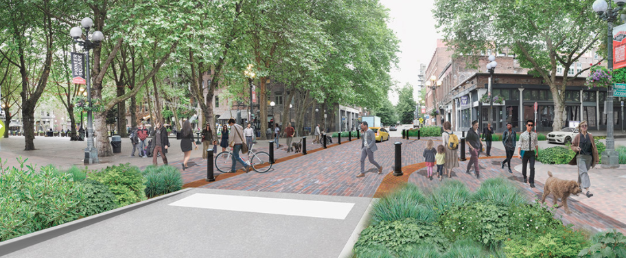 The biggest changes here will be made on Washington and Main Streets, low-traffic streets on either side of Occidental Park, which itself used to be a continuation of Occidental Avenue. Washington Street here would become a one-way street toward Elliott Bay with Main Street a one-way counterpart toward downtown. The roadway would be narrowed with bollards to prevent vehicles from entering the pedestrian space and the park, which would bleed into the “sidewalk” space with the removal of any curb. Despite being the place you’d most expect to see seating added of all the locations, –after all, it is a park— no seating is proposed in the vicinity of Occidental Park here.