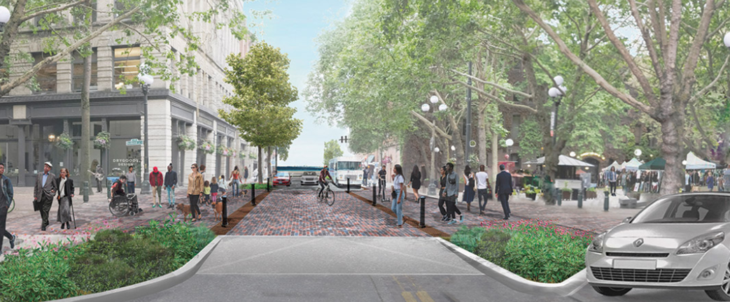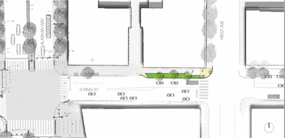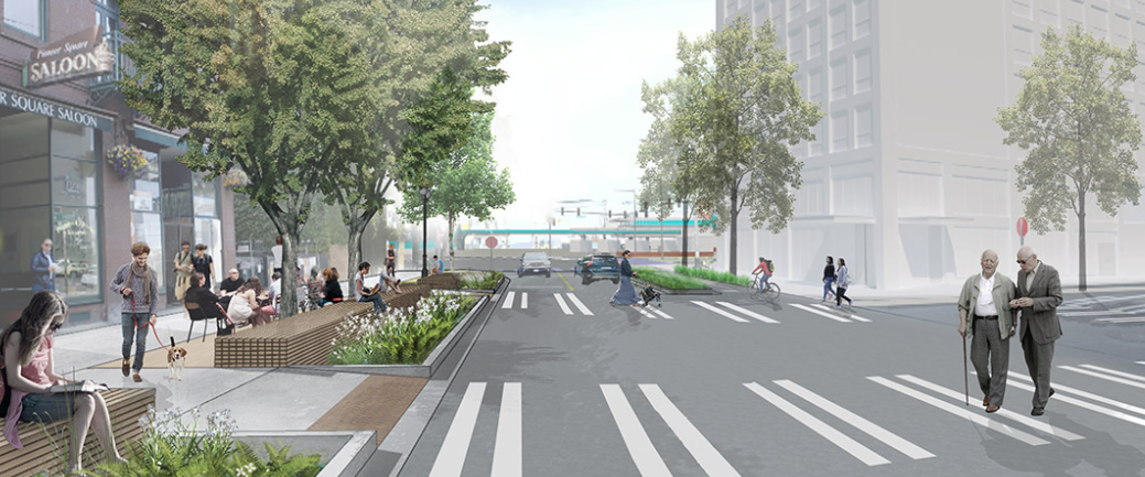Yesler Way is the street with the highest level of vehicle traffic planned for upgrades as part of this project. Between Western Ave and Alaskan Way, the curb would be extended into the street to install plantings and seating. It’s unclear exactly how pleasant it will be to sit here, as it’s steps from nine-lane Alaskan Way and along one of the primary corridors people use when they disembark a Washington State Ferry at Colman Dock.