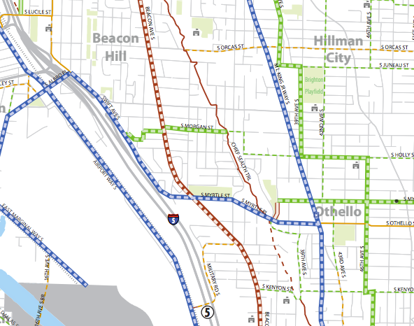 One of the planned bike facilities, and indeed one of the first protected bike lane projects in South Seattle ever, was set to get installed next year as SDOT repaves a large stretch of road next to I-5 on Beacon Hill’s west slope. Swift Ave S follows I-5 and turns into S Myrtle St and S Othello St at the light rail station on MLK Way S. This connection would allow people on bikes to get from the light rail station to the bridge across I-5 at S Albro St and into Georgetown and beyond.
