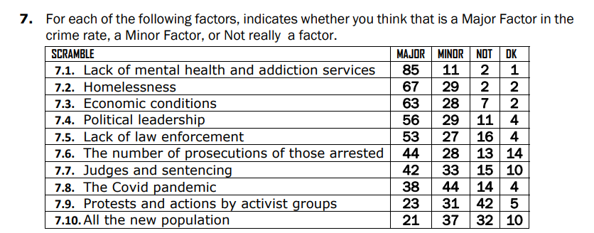 Additionally, the lack of law enforcement was identified as a major factor in the crime rate by 53% of respondents, which was well behind the lack of mental health and addiction services at 85%, homelessness at 67%, and economic conditions at 63%. The “Crosscut Elway” poll of 400 Seattle voters was conducted by McGuire Research between April 20 and 25, with a stated 5% margin of error.
