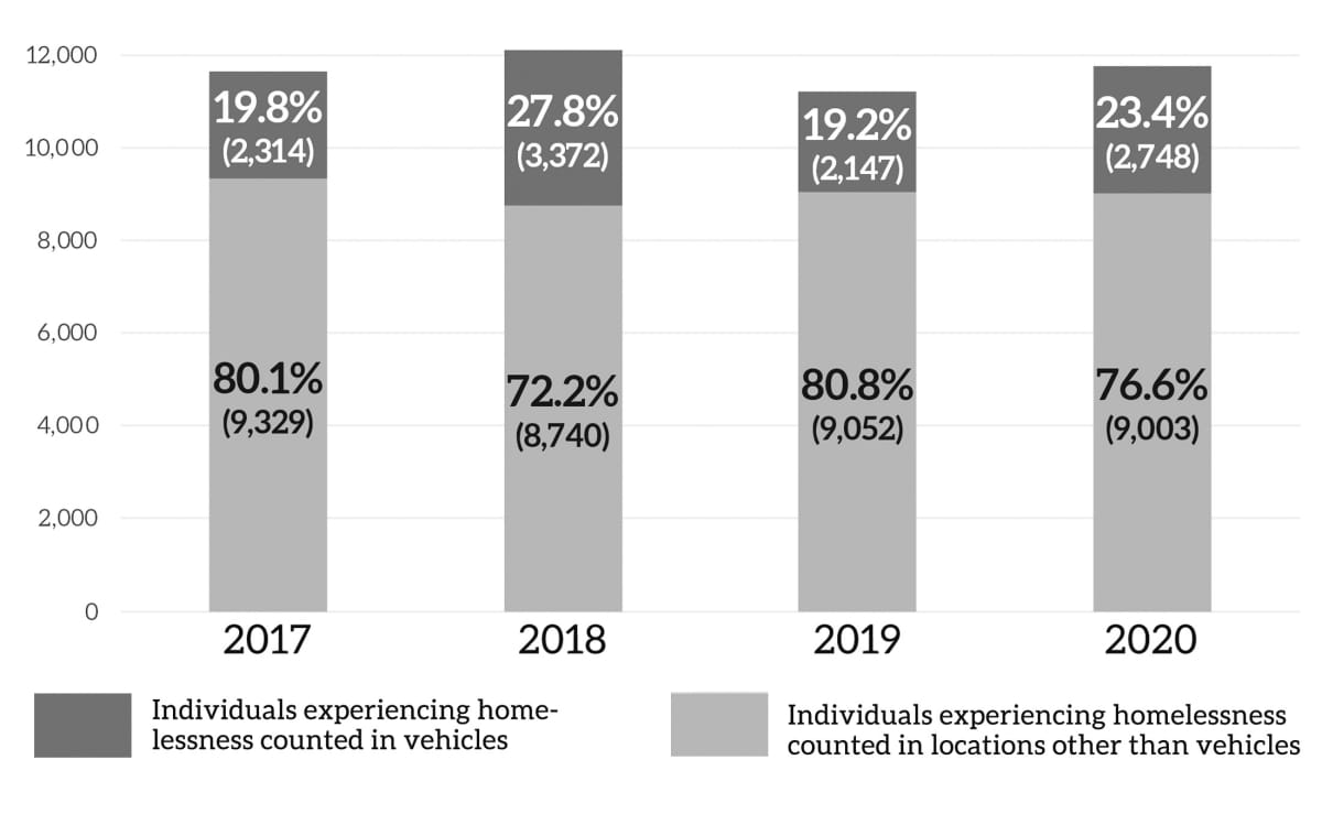 Some refer to vehicle residents as “the forgotten homeless”: people who fall through the gaping cracks in services and programs meant to help people experiencing homelessness. Some have too many resources to qualify for government assistance; others consider the tradeoff between their greatest asset — their vehicle — and less attractive shelter options to be a poor one.