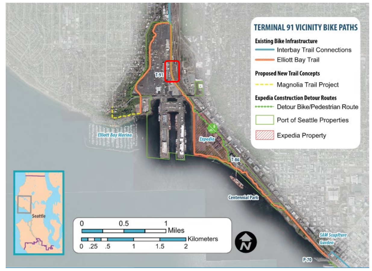 “I am delighted to report that the Port of Seattle Commission just authorized this significant improvement to the bike path across Terminal 91 through Interbay,” Commissioner Fred Felleman said in a statement following the unanimous vote. “It has been a long priority of mine to widen the bike path and remove the bridge in order to enhance cyclists’ experience and to encourage this healthy form of commuting. It’s another example of where we’re working to further the coexistence of commerce and communities.”
