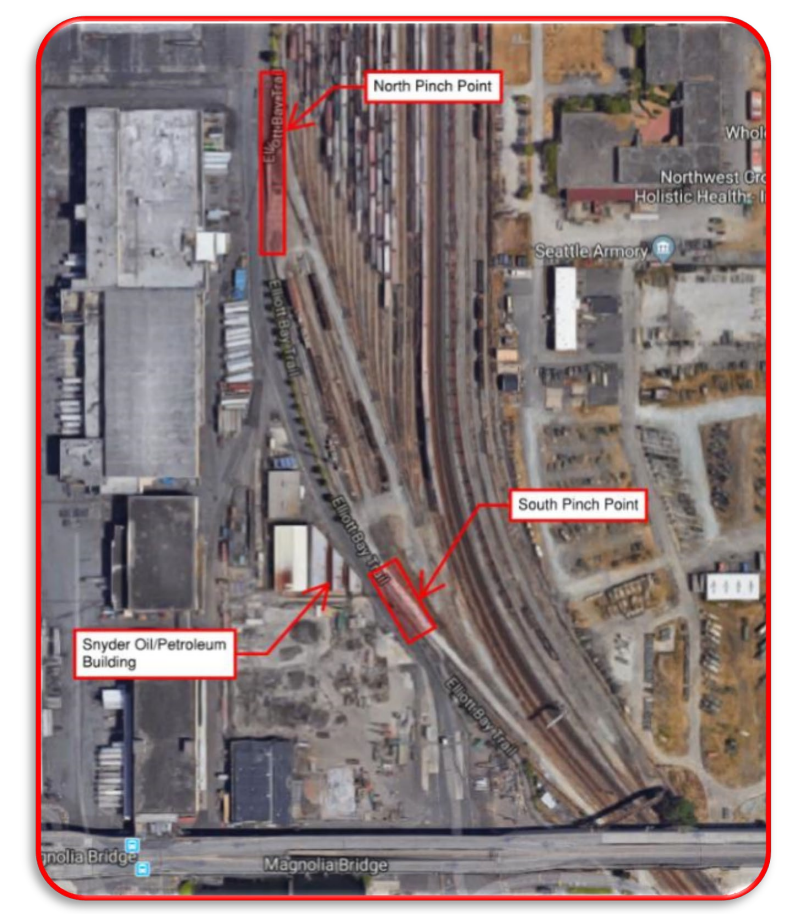 When complete, the narrowest segment of the trail will still remain the site of the south pinch point thanks to BNSF’s easement, but that pinch point will be widened to 8.5 feet without a buffer on either side. The Port did consider what it would take to widen the trail south of the existing bridge to a ten-foot standard width to match the rest of the trail. The answer? An additional $4 to $7 million to completely relocate the nearby rail spur.