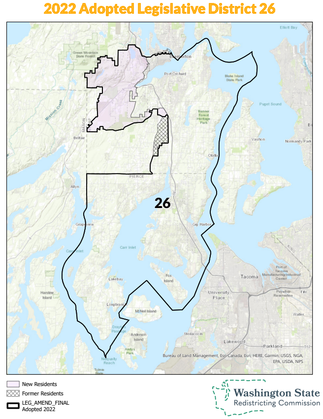 LD42 is a tossup leaning slightly toward Republicans. Since Democrats hold both House seats in this district, but not the Senate seat, this could be where Democrats lose seats in the House, but, if they lose, it’ll be a wash in the Senate. If Democrat Sharon Shewmake wins despite a relatively weak 47% showing in the primary, Democrats’ senate advantage appears very likely to actually increase. Redistricting ended up making minor changes in LD42, but by losing a small piece of Bellingham, the district seems to have shifted right a bit.