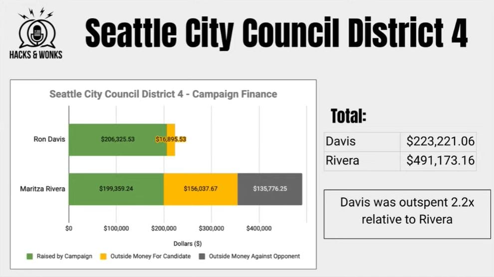 For example, in the closest 2023 race, centrists outraised progressives by more than double, likely providing the difference, given Maritza Rivera’s tight 235-vote victory margin over Ron Davis, who was backed by progressive groups including The Urbanist. The degree varied, but all losing progressives were vastly outspent in 2023.
