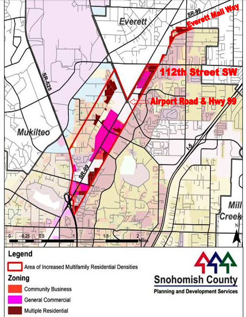 Snohomish County policymakers were thinking along those transit-oriented development lines when they implemented a rezone increasing housing density along the unincorporated portion of Evergreen Way (SR-99) corridor. County Executive Dave Somers signed legislation raising height limits to 75 feet along Evergreen Way and upping the density limit from 22 dwellings per acre to 58 dwellings per acre. The City of Edmonds had already done similarly just to the south in 2017. Despite its roots as car-dominated space lined with parking and drive-thru retail, many people are envisioning the SR-99 corridor as a center of dense walkable development, from Seattle urbanists to Everett boosters.