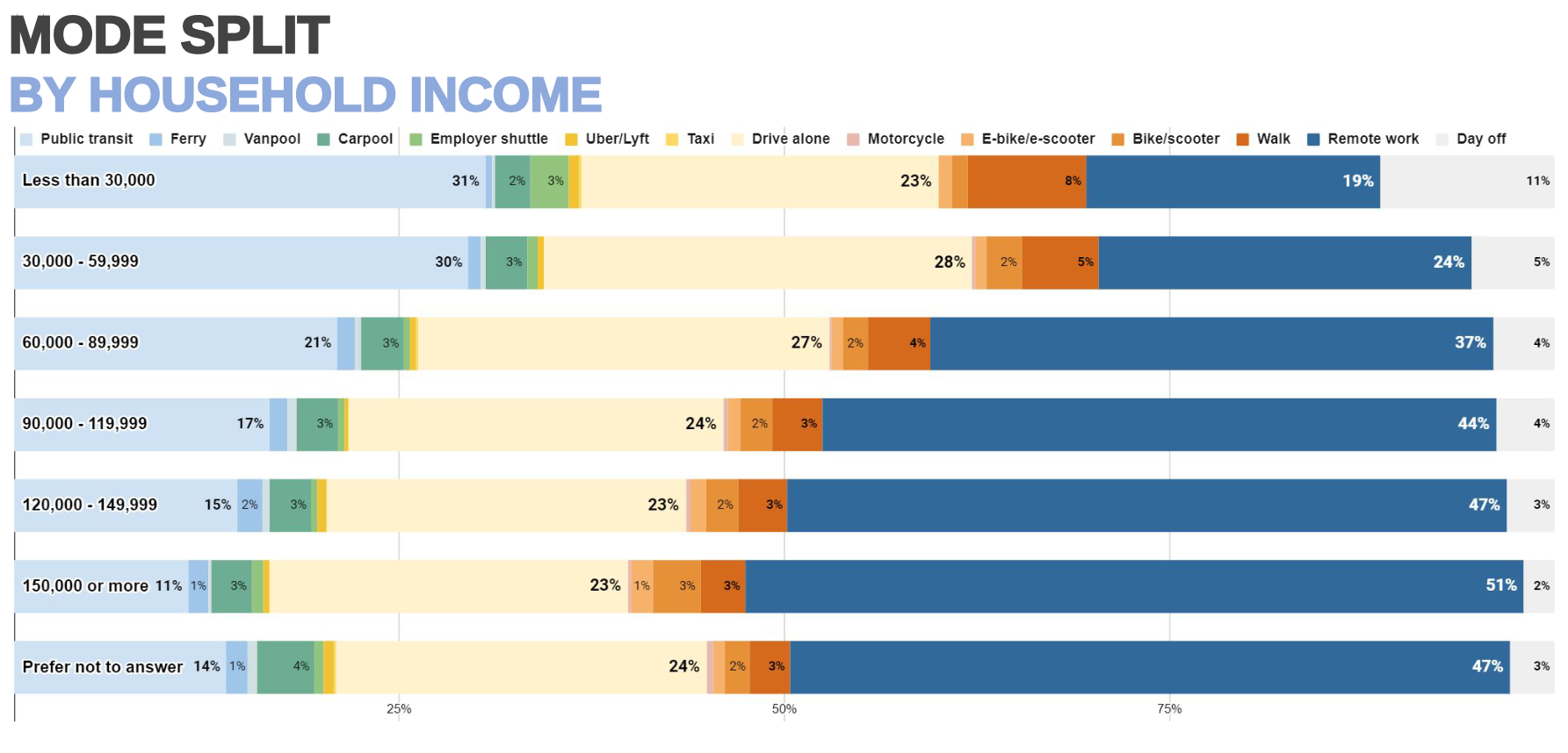 A preference for cars rather than transit does not explain this shift: the share of drivers decreased along with transit commuters. Further data from the 2017 US census revealed Seattle’s transit was more popular among those earning more than $75,000 a year than those earning less, meaning workers possessing the financial means to drive alone still chose transit. When cross-referenced with current commute modes by income — where high earners are roughly twice as likely to work remotely as low earners — remote work appears to have accounted for the greatest share of transit’s declined use.