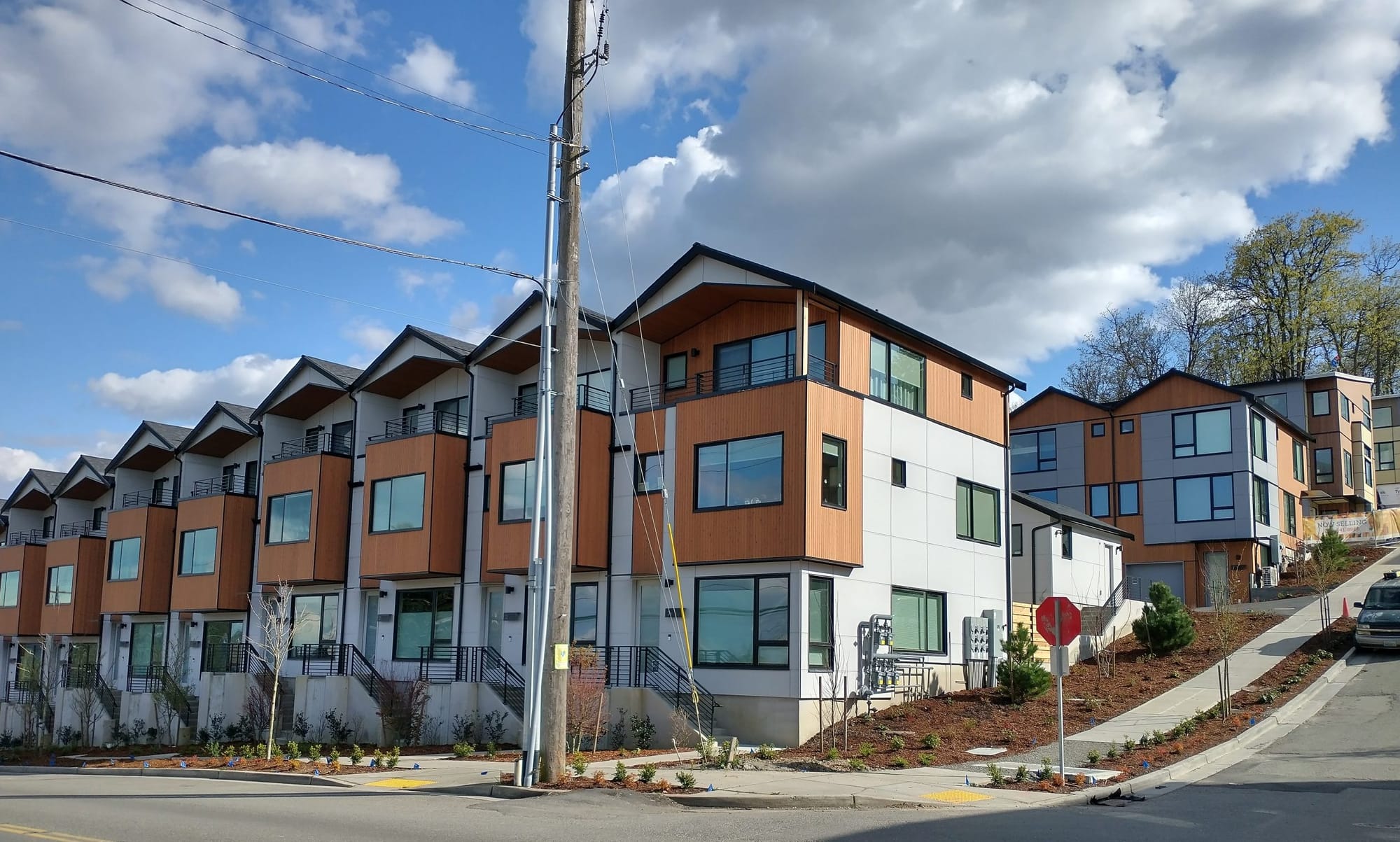 Uphill from the station, several blocks west on Cloverdale Street, at 8620 39th Avenue S and 8612 39th Avenue S, developers are building a total of 22 units in a variety of three-story townhouses — part of larger group of new townhomes in the surrounding blocks. The project is nearing completion and some homes are for sale. One block away, at 8608 42nd Avenue S, another developer is constructing five new townhomes within a short walk from the station.