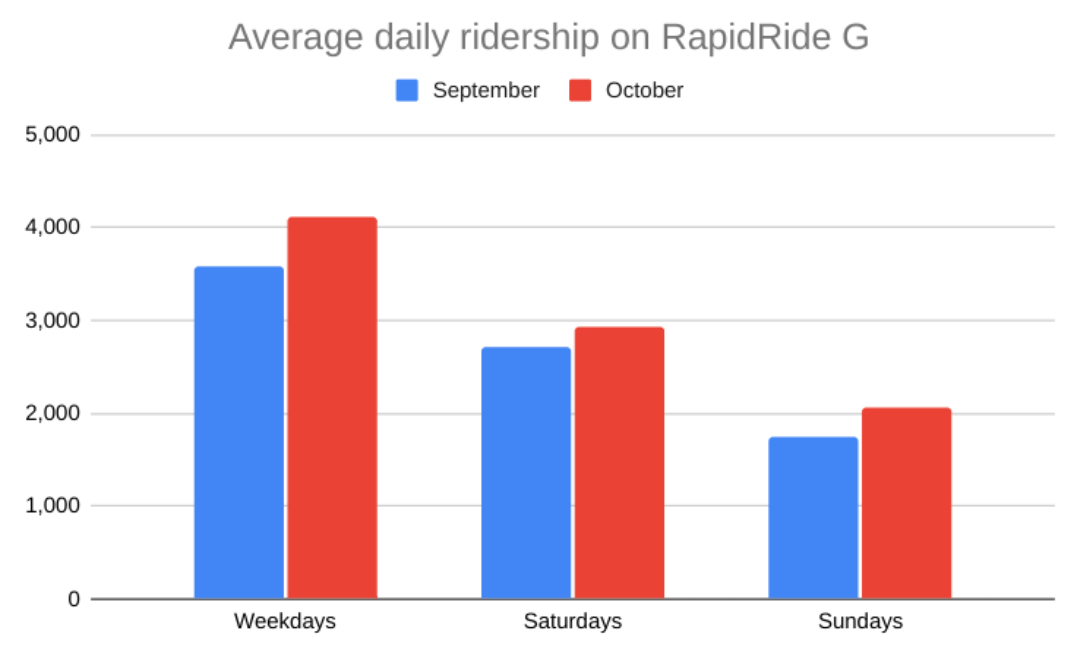 Over the first 26 days of October, average weekday ridership reached 4,111 daily riders, a 15% increase over initial weekday ridership in September. That’s more than twice as many riders as were riding the former Route 12 along Madison Street before the G Line’s arrival.