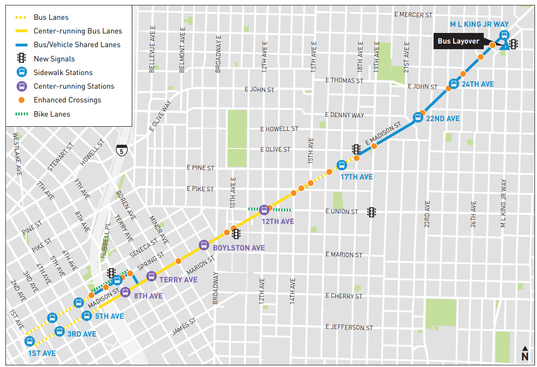 For most of the route, including the most congested segments downtown and around I-5, the RapidRide G will operate in its own dedicated bus lanes. Through First Hill and Capitol Hill, buses will run along the center traffic lane, separating them from any other vehicles turning right, and riders will board from brand new stations in the median of Madison Street, mirroring stations along Jackson Street used by the First Hill Streetcar.