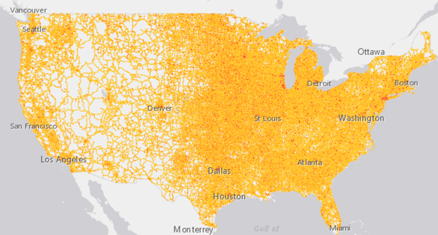 Noise: City Lab also highlighted a map from the Bureau of Transportation Statistics showing America’s staggering amount of noise pollution, which regularly exceeds 80 decibels for about a tenth the population. It’s generally related to proximity to highways and airports.